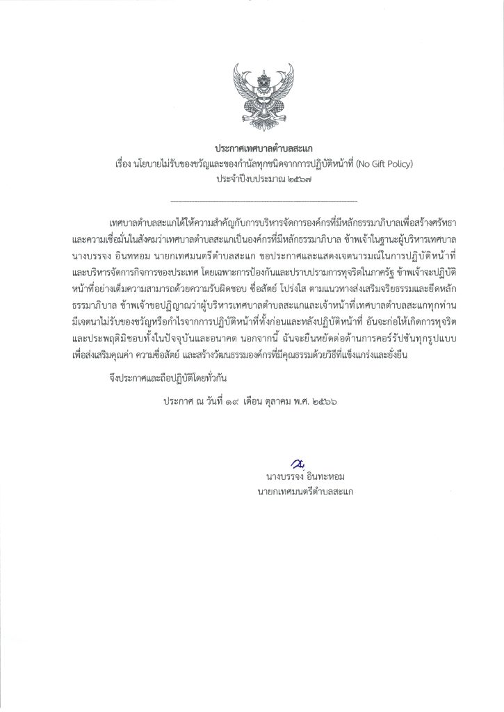 ข่าวประชาสัมพันธ์, ประกาศ ประกาศเทศบาลตำบลสะแก เรื่อง นโยบายไม่รับของขวัญและของกำนัลทุกชนิดจากการปฏิบัติหน้าที่ (No Gift Policy) ประจำปีงบประมาณ 2567 ตุลาคม 19, 2023 / จำนวนคนดู : 69