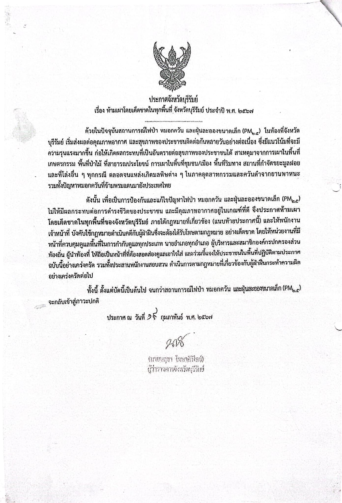 ข่าวประชาสัมพันธ์, ประกาศ ประกาศจังหวัดบุรีรัมย์ เรื่อง ห้ามเผาโดยเด็ดขาดในทุกพื้นที่ จังหวัดบุรีรัมย์ ประจำปี พ.ศ. 2567 มีนาคม 12, 2024 / จำนวนคนดู : 15