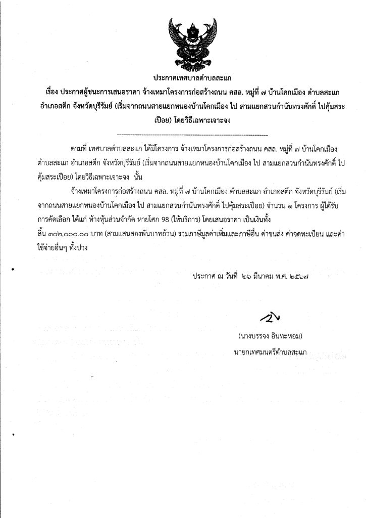 ประกาศเทศบาลตำบลสะแก เรื่อง ประกาศผู้ชนะเสนอราคา จ้างเหมาโครงการก่อสร้างถนน คสล. หมู่ที่ 7 บ้านโคกเมือง ตำบลสะแก อำเภอสตึก จังหวัดบุรีรัมย์ (เริ่มจากถนนสายแยกหนองบ้านโคกเมือง ไป สามแยกสวนกำนันทรงศักดิ์ ไปคุ้มสระเปือย) โดยวิธีเฉพาะเจาะจง