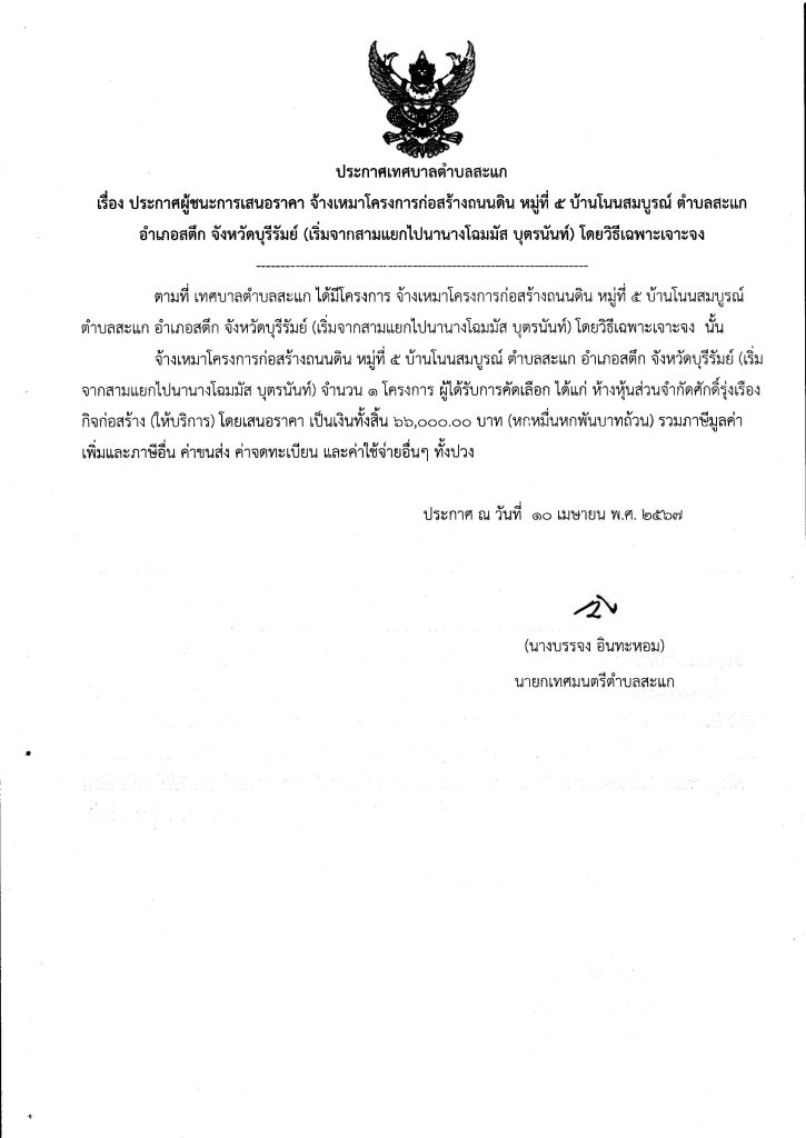 ประกาศต่าง ๆ เกี่ยวกับ การจัดซื้อจัดจ้างหรือ การจัดหาพัสดุ ประกาศเทศบาลตำบลสะแก เรื่อง ประกาศผู้ชนะเสนอราคา จ้างเหมาโครงการก่อสร้างถนนดิน หมู่ที่ 5 บ้านโนนสมบูรณ์ ตำบลสะแก อำเภอสตึก จังหวัดบุรีรัมย์ (เริ่มจากสามแยกไปนานางโฉมนัส บุตรนันท์) โดยวิธีเฉพาะเจาะจง เมษายน 10, 2024 / จำนวนคนดู : 19