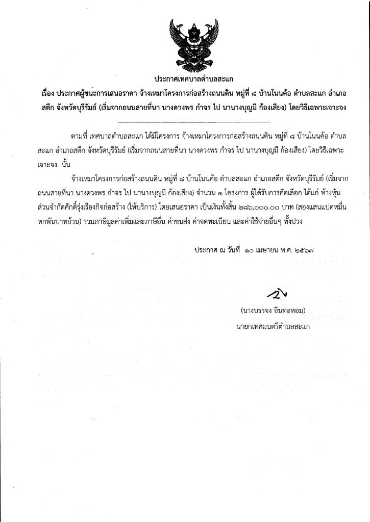 ประกาศเทศบาลตำบลสะแก เรื่อง ประกาศผู้ชนะเสนอราคา จ้างเหมาโครงการก่อสร้างถนนดิน หมู่ที่ 8 บ้านโนนค้อ ตำบลสะแก อำเภอสตึก จังหวัดบุรีรัมย์ (เริ่มจากถนนสายที่นา นางดวงพร กำจร ไป นานางบุญมี ก้องเสียง) โดยวิธีเฉพาะเจาะจง