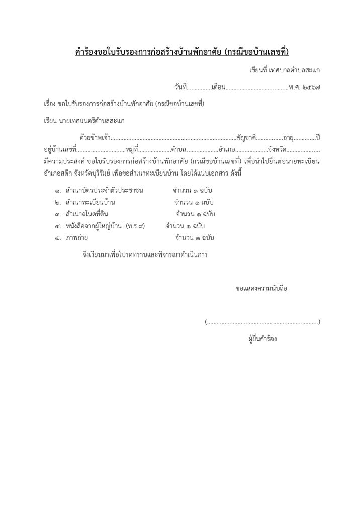 1. ดาวน์โหลด “ คำร้องขอใบรับรองการก่อสร้างบ้านพักอาศัย (กรณีขอบ้านเลขที่) ” ผ่านเว็บไซต์และปริ้นเอกสาร จากนั้นกรอกเอกสารให้เรียบร้อย