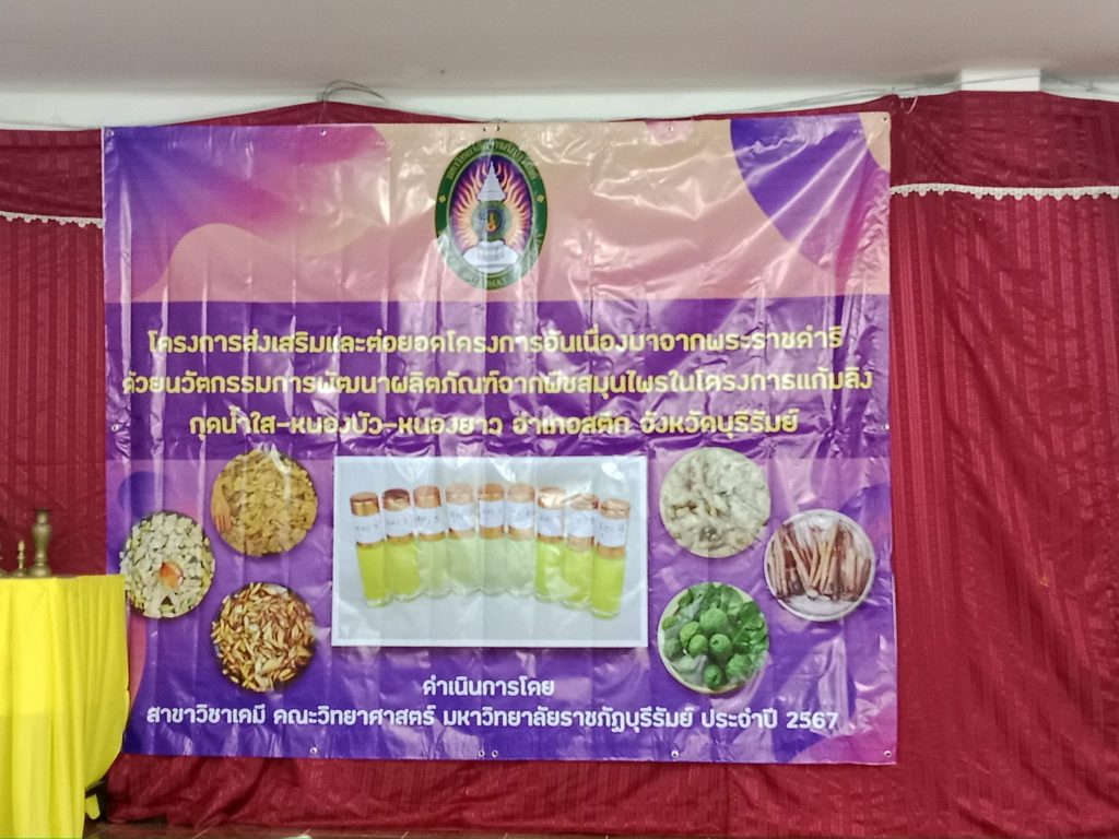 ด้วยนวัตกรรมการพัฒนาผลิตภัณฑ์ จากพืชสมุนไพรในโครงการแก้มลิง กุดน้ำใส-หนองบัว-หนองยาว อำเภอสตึก จังหวัดบุรีรัมย์ ภายใต้โครงการยุทธศาสตร์มหาวิทยาลัยราชภัฏบุรีรัมย์ เพื่อการพัฒนาท้องถิ่น ประจำปีงบประมาณ 2567 ร่วมกับเทศบาลตำบลสะแก เรื่อง การเตรียมพืชสมุนไพรและการแปรรูปผลิตภัณฑ์