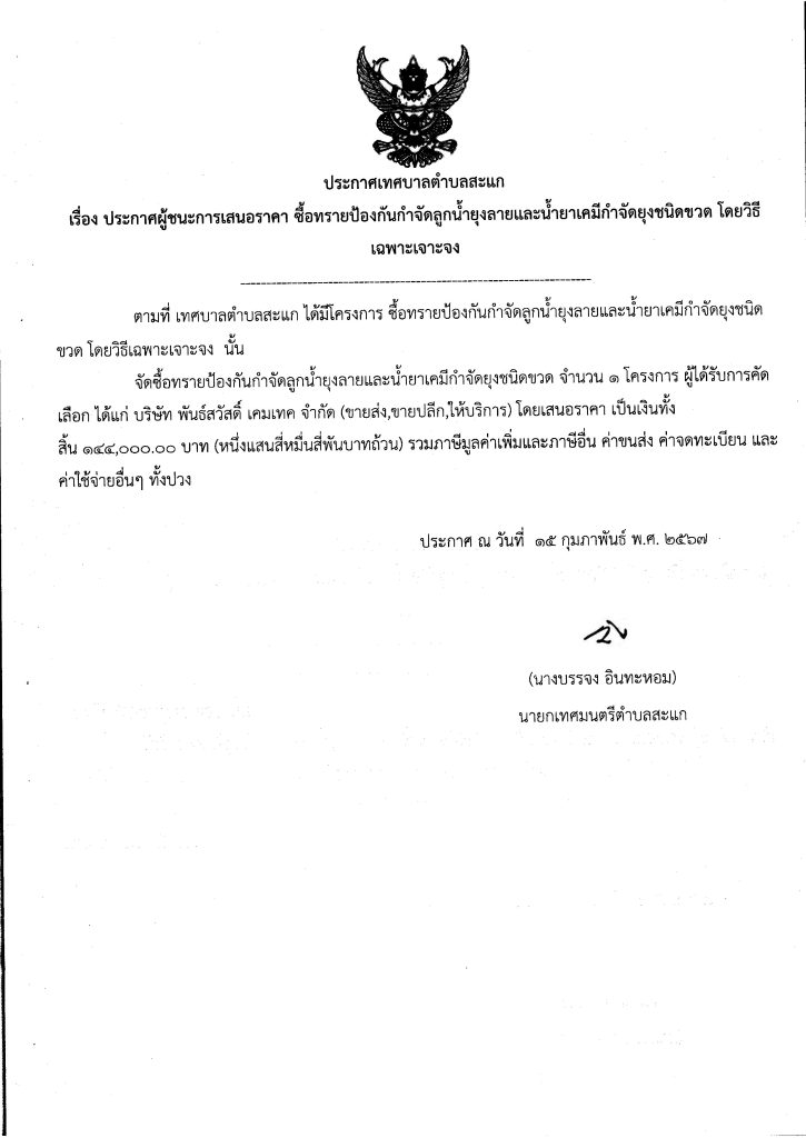 ประกาศเทศบาลตำบลสะแก เรื่อง ประกาศผู้ชนะเสนอราคา ซื้อทรายป้องกันกำจัดลูกน้ำยุงลายและน้ำยาเคมีกำจัดยุงชนิดขวด โดยวิธีเฉพาะเจาะจง