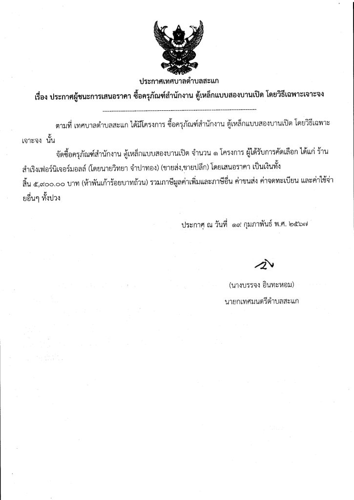 ประกาศต่าง ๆ เกี่ยวกับ การจัดซื้อจัดจ้างหรือ การจัดหาพัสดุ ประกาศเทศบาลตำบลสะแก เรื่อง ประกาศผู้ชนะเสนอราคา ซื้อครุภัณฑ์สำนักงาน ตู้เหล็กแบบสองบานปิด โดยวิธีเฉพาะเจาะจง กุมภาพันธ์ 19, 2024 / จำนวนคนดู : 10