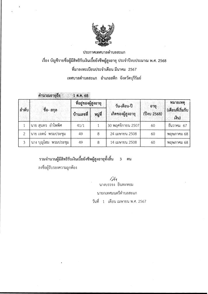 ข่าวประชาสัมพันธ์, ประกาศ ประกาศเทศบาลตำบลสะแก เรื่อง บัญชีรายชื่อผู้มีสิทธิรับเงินเบี้ยยังชีพผู้สูงอายุ ประจำปีงบประมาณ พ.ศ. 2568 ที่มาลงทะเบียนประจำเดือน มีนาคม 2567 เทศบาลตำบลสะแก อำเภอสตึก จังหวัดบุรีรัมย์ เมษายน 1, 2024 / จำนวนคนดู : 7