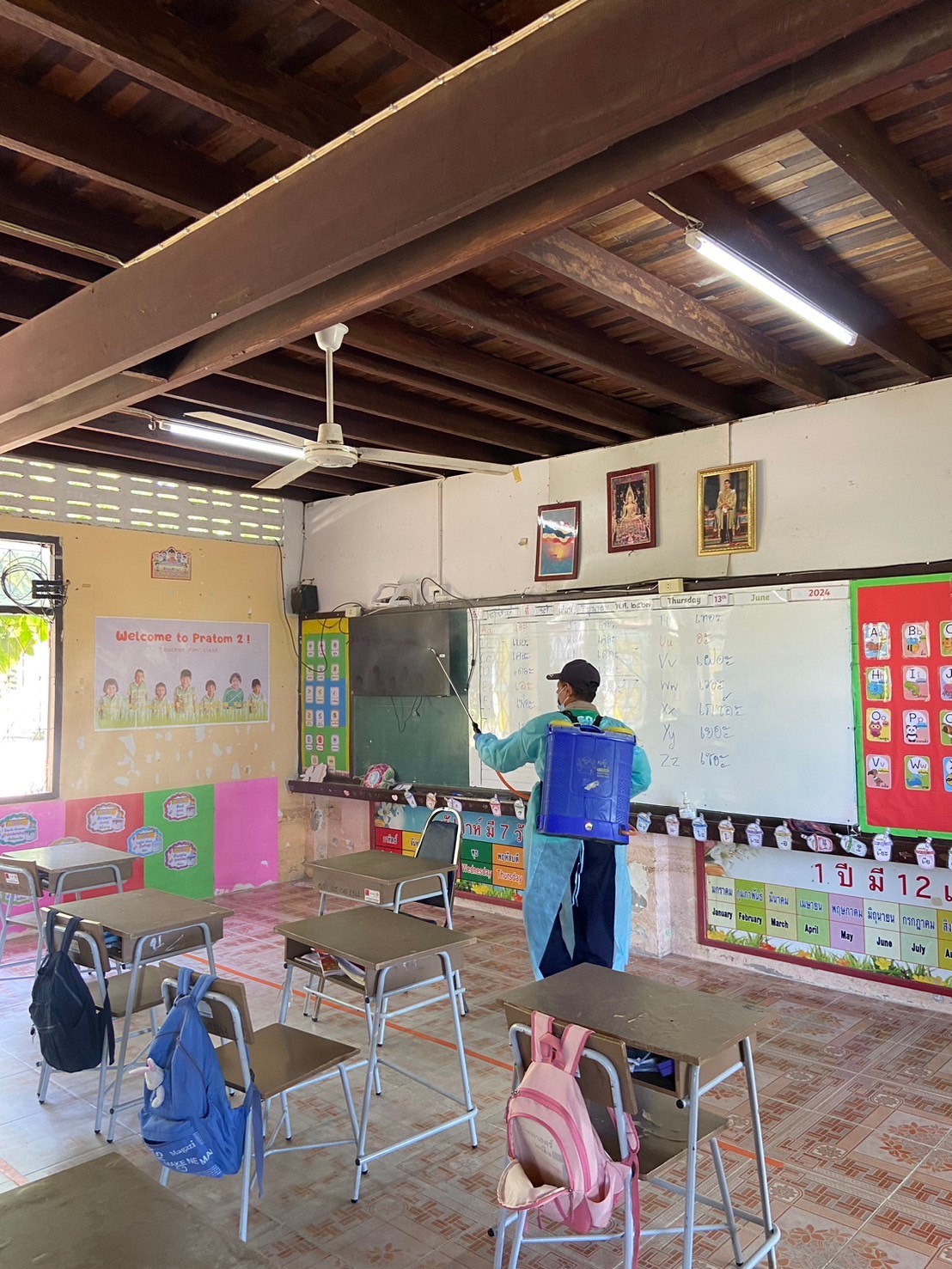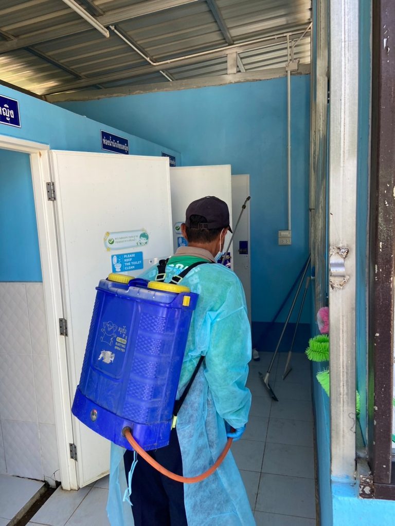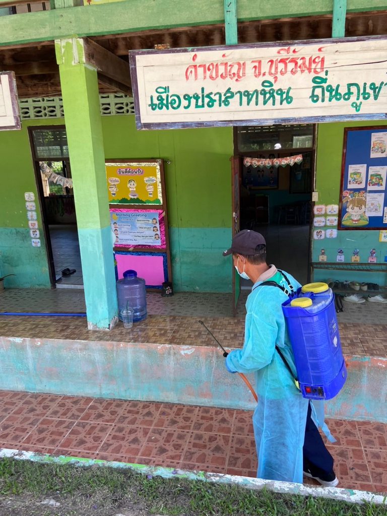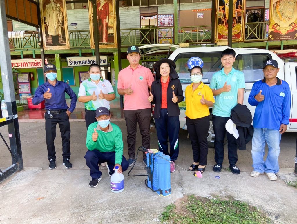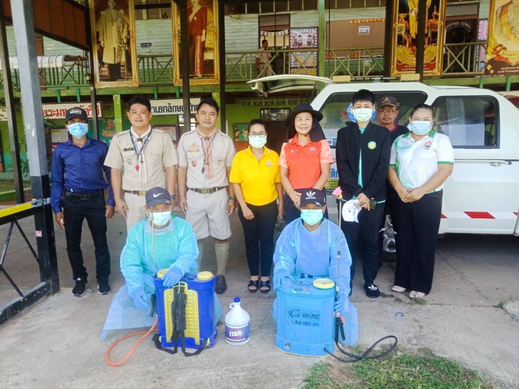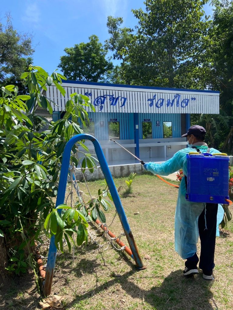 ฉีดพ่นยาฆ่าเชื้อ เพื่อป้องกันการระบาดของโรคมือเท้าปากในเด็กนักเรียนโรงเรียนชุมชนบ้านสะแก