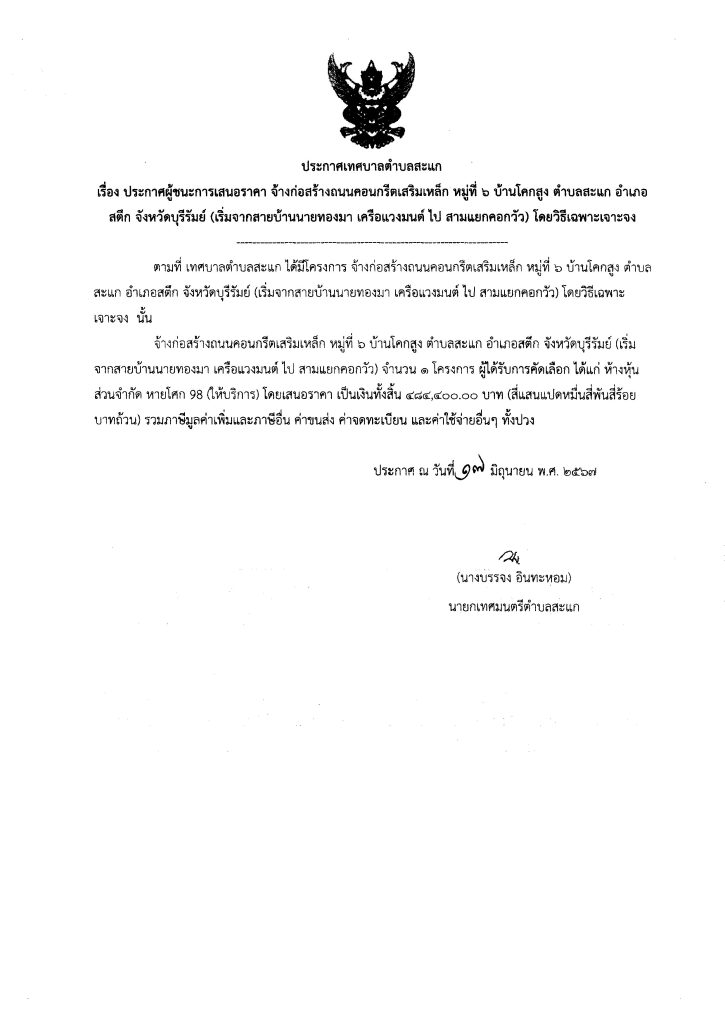 ประกาศต่าง ๆ เกี่ยวกับ การจัดซื้อจัดจ้างหรือ การจัดหาพัสดุ ประกาศเทศบาลตำบลสะแก เรื่อง ประกาศผู้ชนะเสนอราคา จ้างก่อสร้างถนนคอนกรีตเสริมเหล็ก หมู่ที่ 6 บ้านโคกสูง ตำบลสะแก อำเภอสตึก จังหวัดบุรีรัมย์ (เริ่มจากสายบ้านนายทองมา เครือแวงมนต์ ไป สามแยกคอกวัว) โดยวิธีเฉพาะเจาะจง มิถุนายน 17, 2024 / จำนวนคนดู : 6