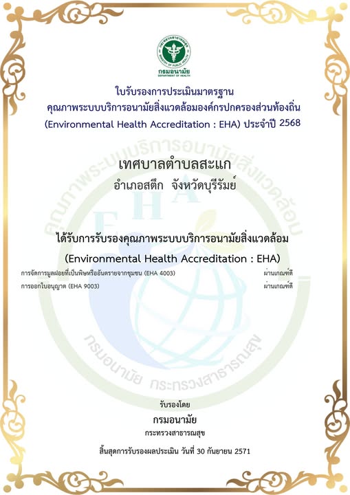 กิจกรรม, ข่าวประชาสัมพันธ์ เทศบาลตำบลสะแก ได้ใบรับรองการประเมินมาตราฐาน คุณภาพระบบบริการอนามัยสิ่งแวดล้อมองค์กรปกครองส่วนท้องถิ่น (Environmental Health Accreditation : EHA) ประจำปี 2568 รับรองโดย กรมอนามัย กระทรวงสาธารณสุข มิถุนายน 27, 2025 / จำนวนคนดู : 4