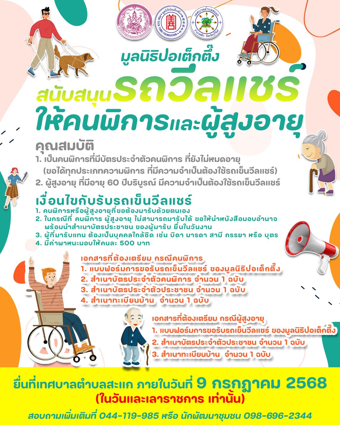 กิจกรรม, ข่าวประชาสัมพันธ์ ประชาสัมพันธ์มูลนิธิป่อเต็กตึ๊ง สนับสนุนรถวีลแชร์ให้คนพิการและผู้สูงอายุ สามารถยื่นเอกสารเพื่อขอรับ ภายในวันที่ 9 กรกฎาคม 2568 ที่ เทศบาลตำบลสะแก อำเภอสตึก จังหวัดบุรีรัมย์ (ในวันและเวลาราชการเท่านั้น) กรกฎาคม 3, 2025 / จำนวนคนดู : 6